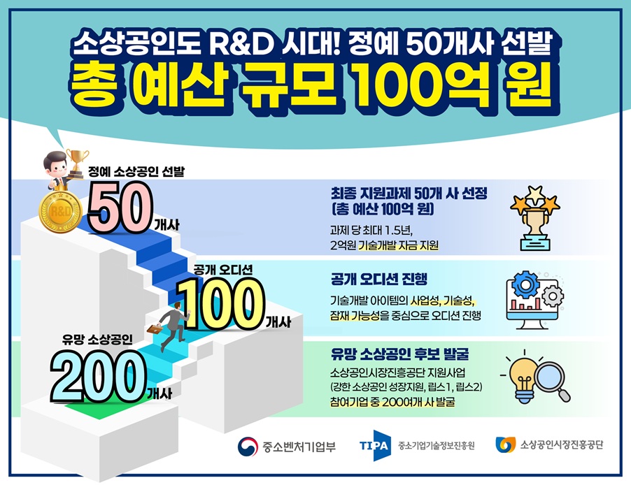 이에 따라 지난 3월 소상공인시장진흥공단에서 생활기반 유망 소상공인 및 기업가형 소상공인 200여개사를 발굴하였으며, 오는 6월 중소기업기술정보진흥원과 소상공인시장진흥공단이 공동으로 진행하는 공개 오디션을 거쳐 최종 50개 기업을 선발할 예정입니다.