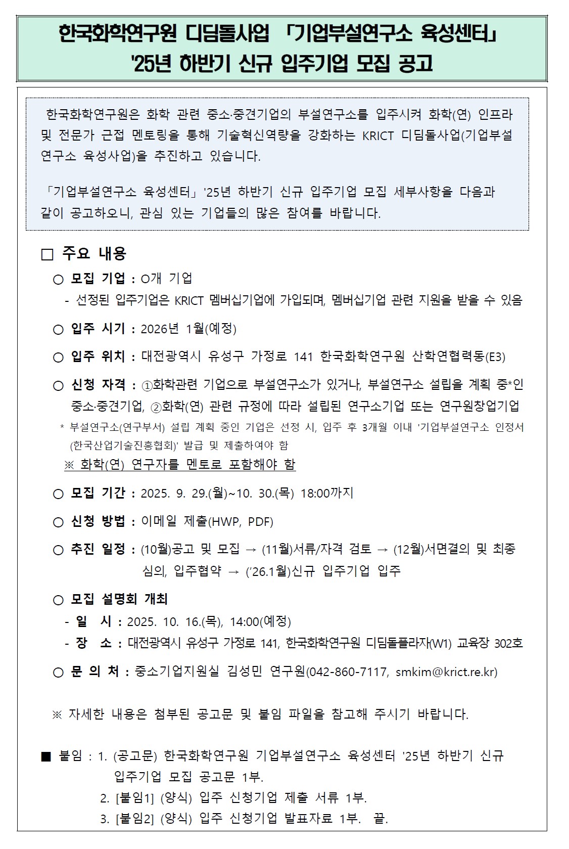 리스트 상세| [유관기관 소식] [한국화학연구원] 디딤돌사업 '기업부설연구소 육성센터' 2025년 하반기 신규 입주기업 모집 공고 | |||||