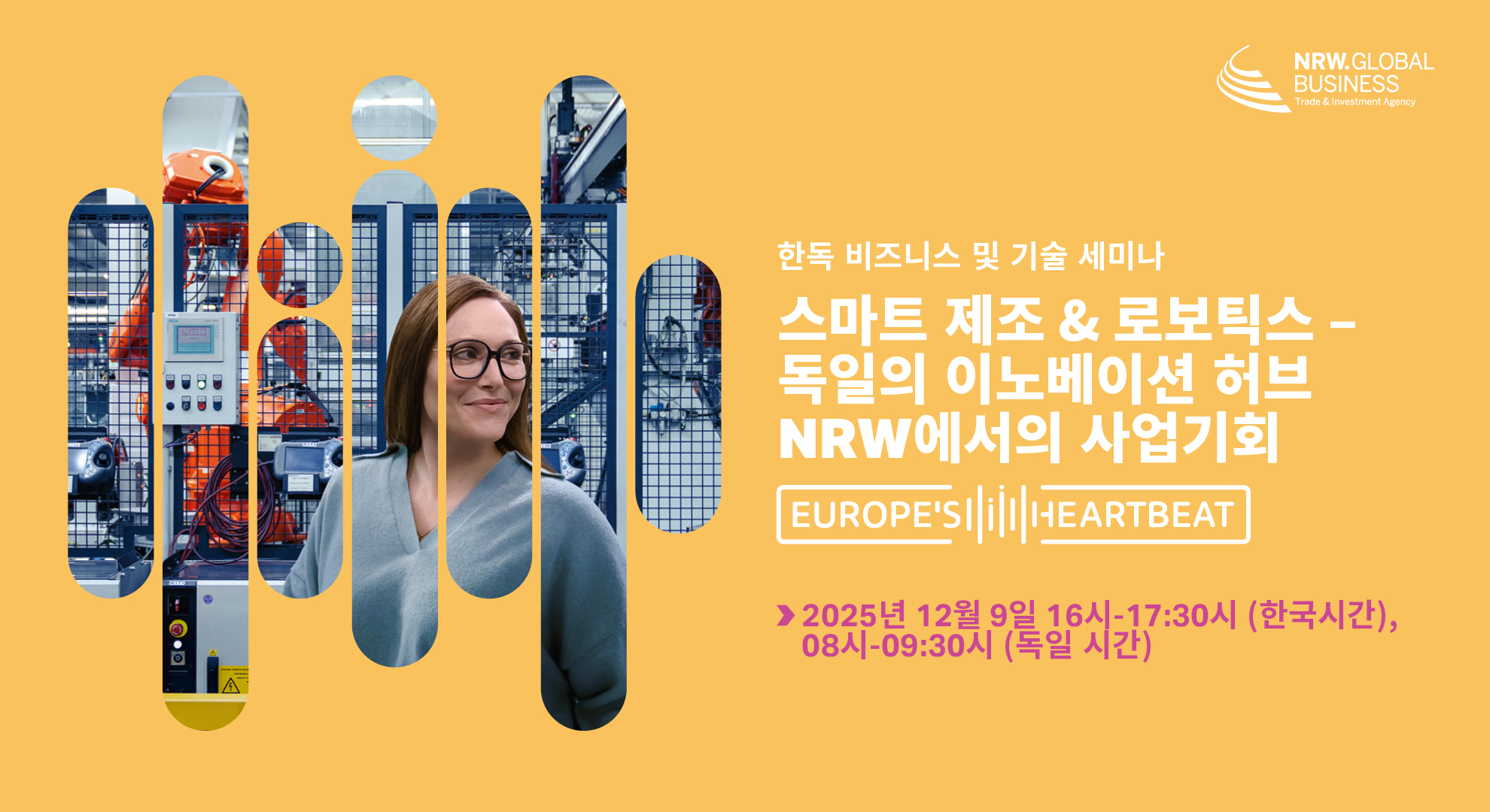 NRW Global 은 12 월 9 일 ( 화 ) ' - 스마트 제조 & 로보틱스 : 독일의 이노베이션 허브 NRW 에서의 사업기회 ' 를 개최합니다 . 이번 온라인 웨비나는 독일 스마트 제조 , 로보틱스 개요 , 네트워크 및 파트너십 , 시장 진입 전략을 제공하며 , 특히 한국 기업을 위한 맞춤형 정보도 다룰 예정입니다 . NRW 는 유럽의 주요 혁신 허브로서 , 연구기관과의 협력을 통해 신기술 개발에서 강점을 보유하고 있습니다. 독일 시장 진출을 준비하시는 기업분들의 많은 관심과 참여를 부탁드립니다 . 1. 일시 : 2025.12.09( 화 ), 16:00~17:30 2. 장소 : 온라인 3. 주최 : NRW Global ( 기술지원 : 주한독일상공회의소 ) 4. 언어 : 한국어 , 영어 ( 동시통역 제공 ) 5. 참가비용 : 무료 6. 등록링크: 링크 6. 문의 사항 : 강규원 대리 (kwkang@kgcci.com) |