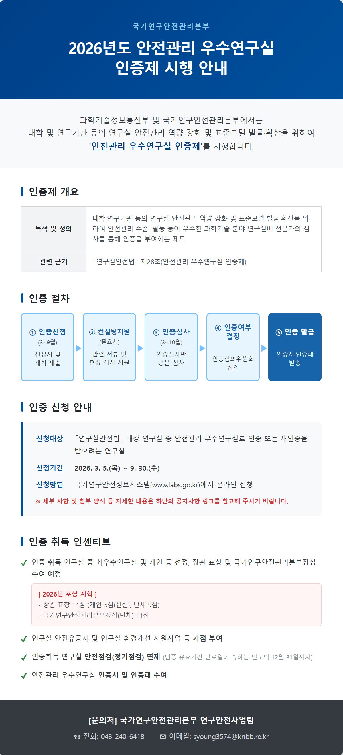 | [유관기관 소식] [ 국가연구안전관리본부] 2026년도 안전관리 우수연구실 인증제 시행 안내 | |||||