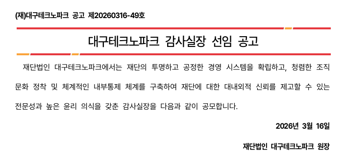 | [유관기관 소식] [대구테크노파크] 감사실장 선임 공고 안내 | |||||
