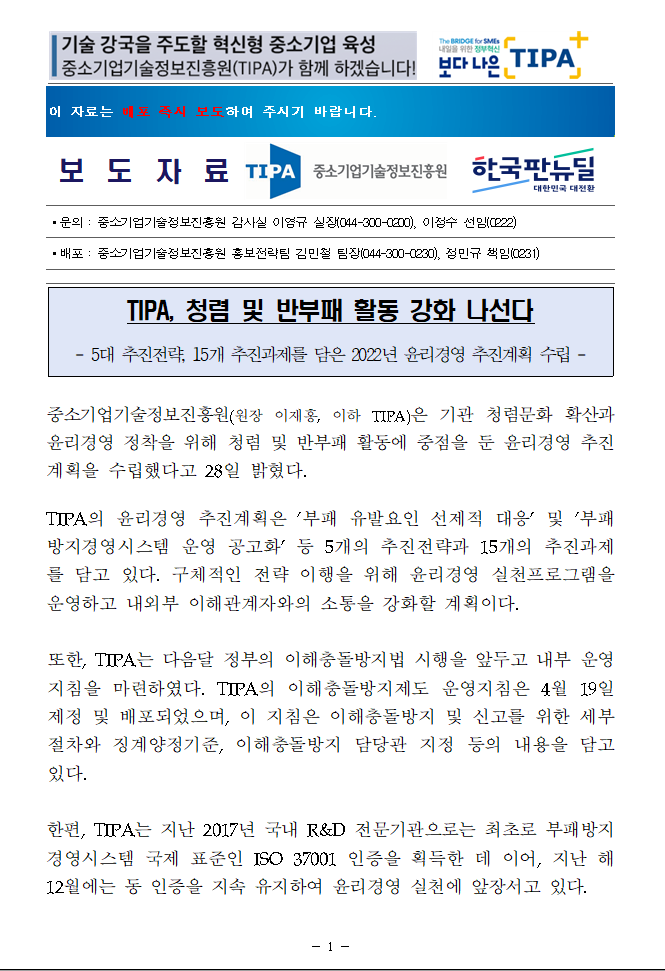 [보도자료] TIPA, 청렴 및 반부패 활동 강화 나선다