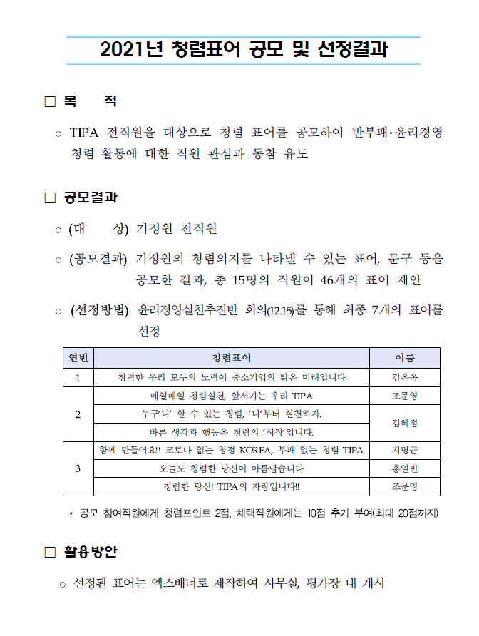 윤리경영 확산을 위한 청렴표어 공모 및 선정 결과
