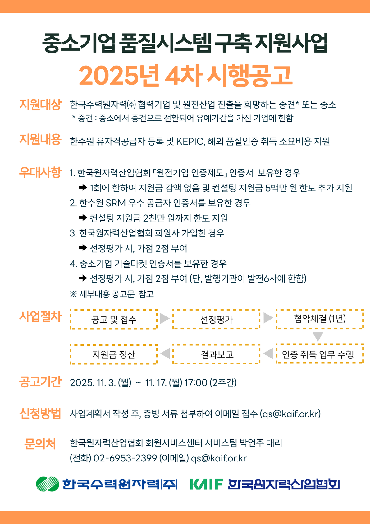 리스트 상세| [유관기관 소식] [한국수력원자력] 중소기업 품질시스템 구축 지원사업 2025년 4차 시행공고 | |||||