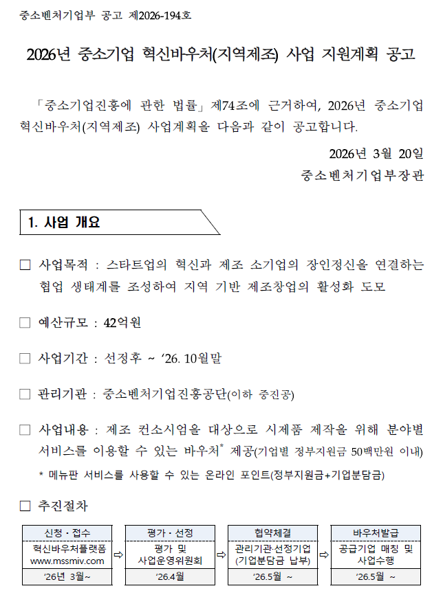 | [유관기관 소식] [중소벤처기업부] 2026년 중소기업 혁신바우처(지역제조) 사업 공고 | |||||