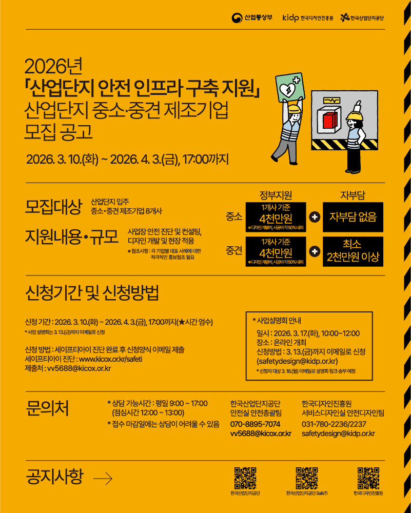 리스트 상세| [유관기관 소식] [한국디자인진흥원] 2026년 산업단지 안전 인프라 구축 지원 산업단지 중소 중견 제조기업 모집 공고 | |||||