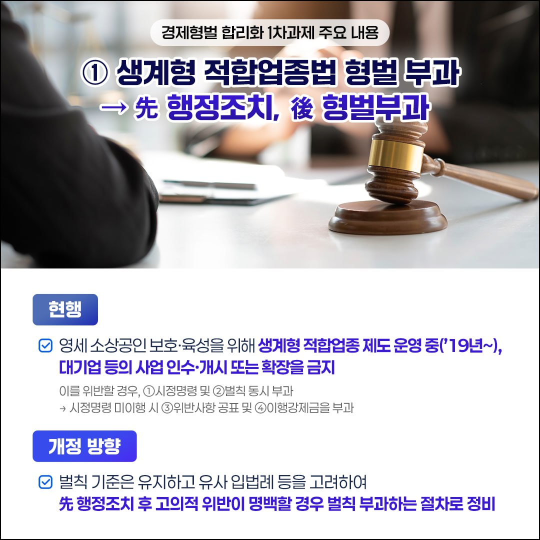 리스트 상세| [유관기관 소식] [중소벤처기업부] 경제형벌 합리화 방안 안내 "중소기업을 범죄자로 만들지 않겠습니다!" | |||||